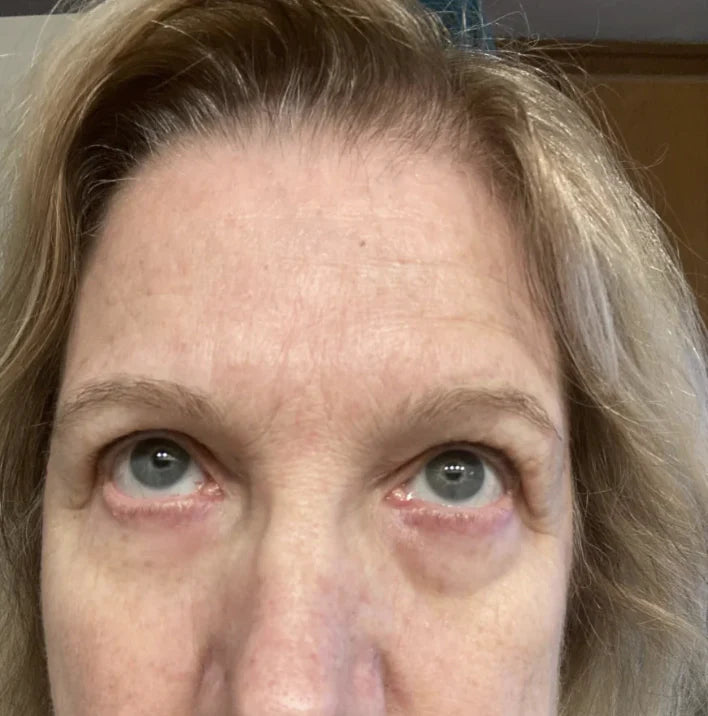 À l’aide de vos doigts ou d’un pinceau sec, étalez une fine couche autour des yeux. Ciblez les cernes, ridules, pattes-d’oie et l’arcade sourcilière. ❌ Évitez la paupière mobile.